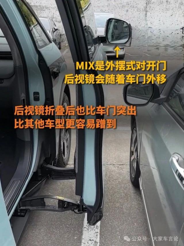 极氪 MIX 开门的方式是专门的摆式对开门。开门时,后视镜会随着门向外移动,超过车身宽度20-30厘米。虽然后视镜已经升级了开门的自动折叠功能,但还是会突出很多...