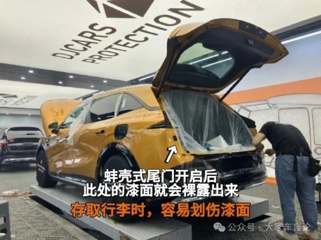 类似极氪 7X 这类蚌壳式启动尾门,打开尾门后裸露的车漆,以后我们都会贴上车衣保护!