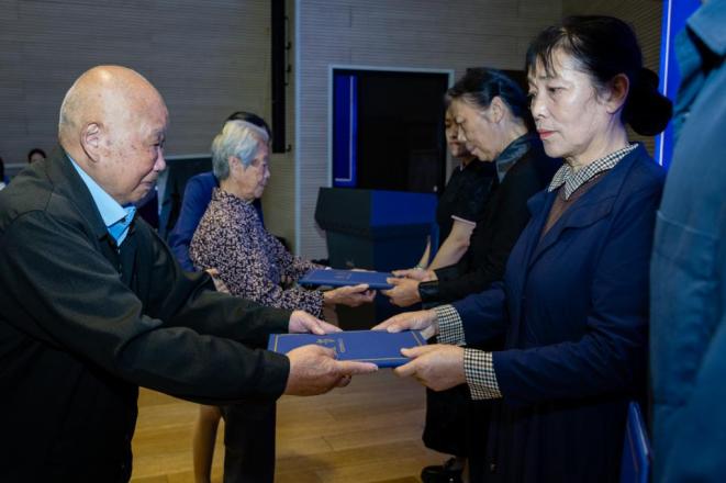 艾义英(左二)于2024年重阳节向第三批南京大屠杀历史记忆传承人颁发证书。