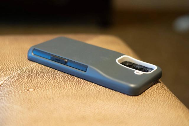Swippitt Link 它是一个符合人体工程学设计的手机壳,质地光滑,边缘圆润。顶部有一个大的摄像头打孔,边缘有一圈白色的细节装饰,增强了视觉层次感。