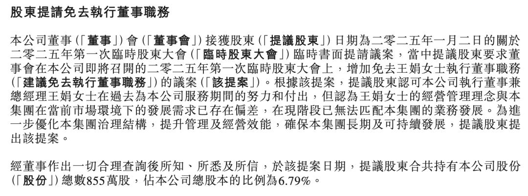 日前,澜沧古茶宣布,总经理王娟因个人身体原因向董事会提交书面辞呈,随后董事会决定将其调任非执行董事。然而,就在公告发布的三天前,澜沧古茶透露,一些股东建议免除王娟的执行董事职务,并要求临时股东大会审议该提案。