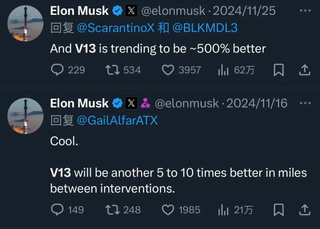 马斯克说:“(现阶段)自动驾驶汽车的性能提升率呈指数级增长。我们有信心自动驾驶汽车的性能在三个月内超过人类驾驶,也就是今年第二季度。”