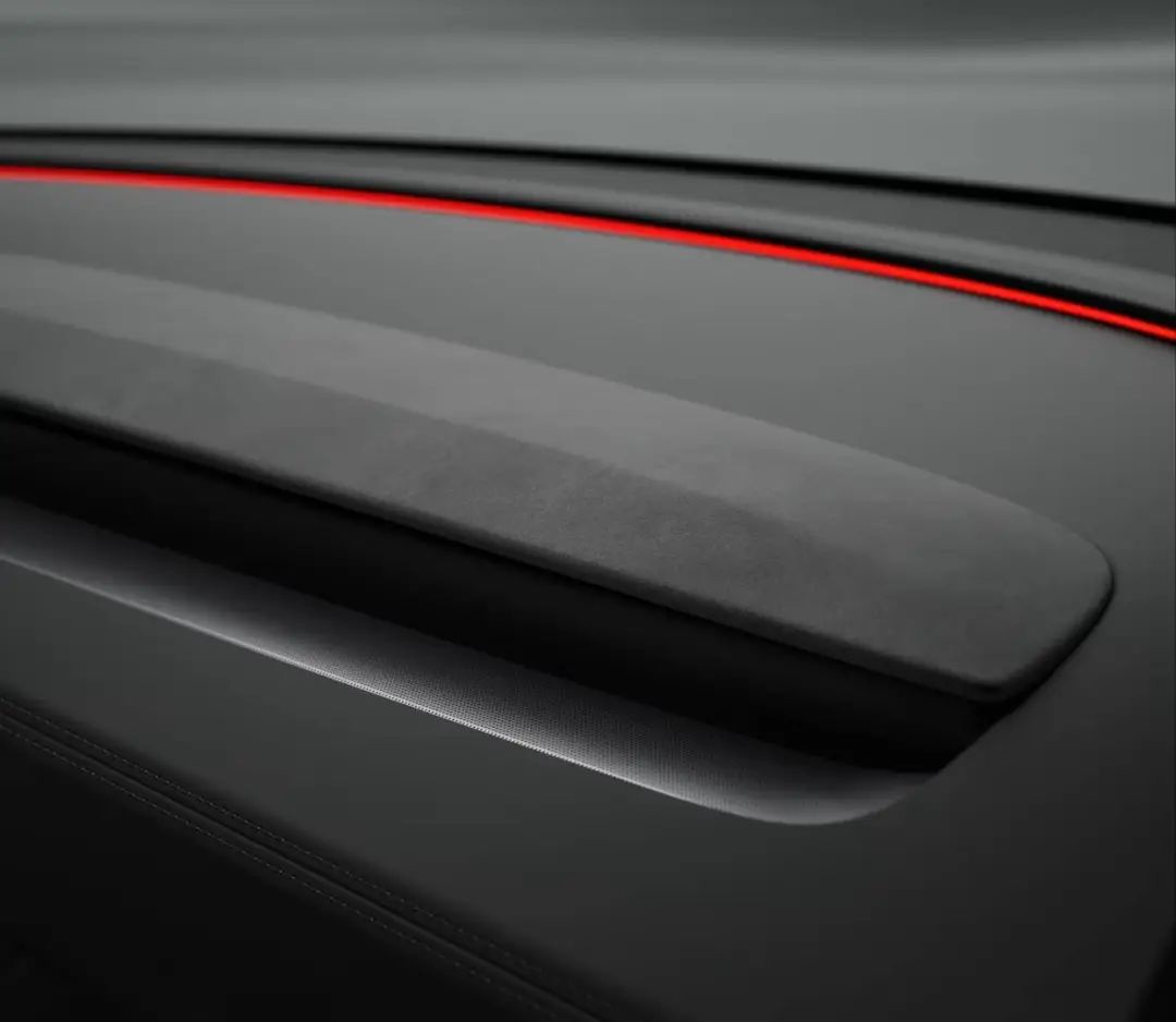 还有两个地方「首发版」独家设计,分别位于手机无线充电区下方「LAUNCH」标记,以及仪表板上的麂皮面板。