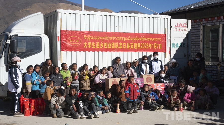 1月8日,在日喀则市定日县长所乡嘎旦村村委会院,一群穿着统一白色衣服的年轻人和孩子合影的场景引起了我们的注意。在拉萨市当雄县乌玛塘乡巴嘎村开办了一家名为西藏姆兰的农业合作社,这是一群从西藏返乡创业的学生。他们还是孩子,但他们选择来到定日县“1.07”地震中受灾最严重的乡镇之一长所乡,帮助另一群孩子,给地震灾区带来“00后”的温暖。