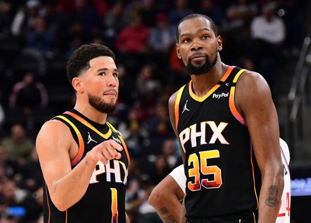 在球场之外,布克更加令人失望。在杜兰特表达一些沮丧的情绪时,布克也经常传递负能量,对球队的防守不满,对一些队友的表现不满,直言不讳地表示全队缺乏攻击性。当他需要在一些关键时刻站出来的时候,他消失了,通常是杜兰特冲锋在前!这个赛季布克打强队的表现如何?打灰熊 20 中 4,打魔术 14 中 5,打雷霆 10 中 2,打 76 人甚至都能 18 中 低效率场次数不胜数,过于依赖三分投射。那么问题来了,为什么要离开比尔?这个赛季比尔场均 18 分 4 篮板 3 助攻,但是比尔的两个准确率 49% 39% 就是和杜兰特一样,把布克的投球数给比尔,比尔的数据会更好。