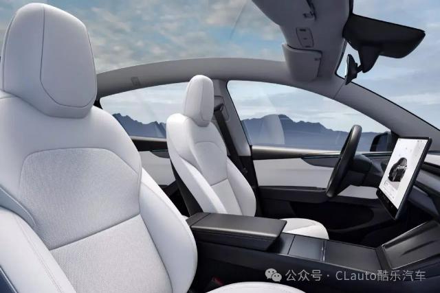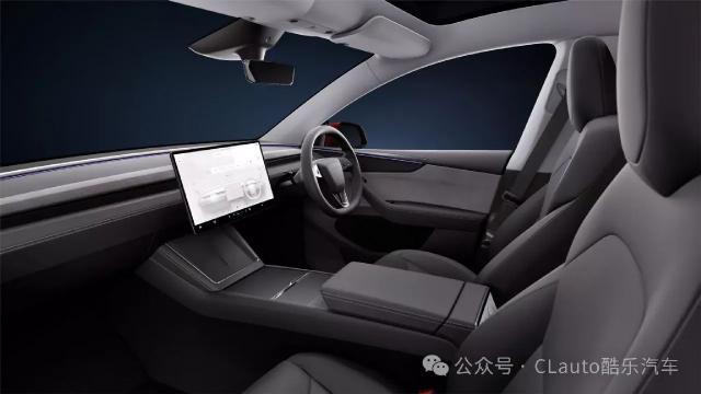 仪表盘、中控台、车门内饰板也进行了重新设计,第一版增加了一条氛围灯带和翻毛皮内饰。和 Model 3 不同的是,这款车的方向盘保留了传统的方向灯拨杆,但档位选择已经集成到中控显示屏上。