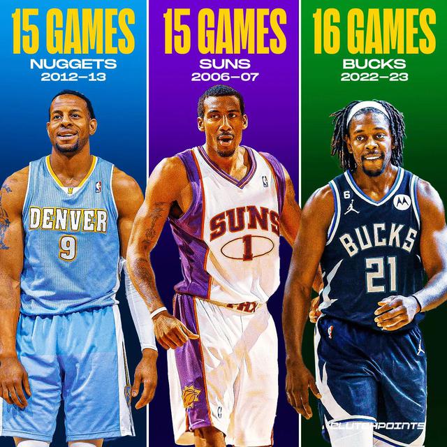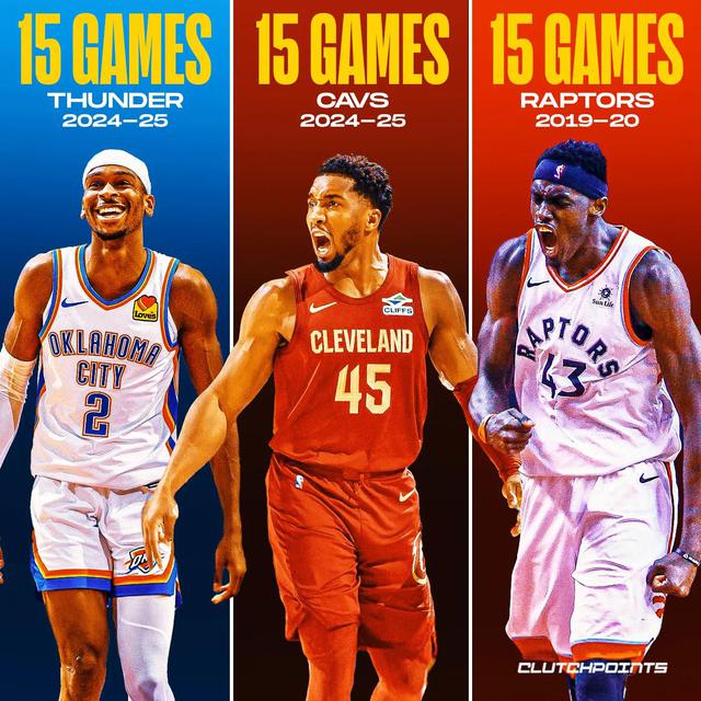 雷霆 2024-25 赛季、骑士 2024-25 赛季、猛龙 2019-20 赛季,掘金 2012-13 赛季、太阳 2006-07 赛季。2024-25 这个赛季有两支球队,分别是雷霆和骑士,不幸的是,雷霆队 16 骑士们已经结束了连胜的理想,但是骑士们现在的连胜还在继续,他们有机会打破更长的连胜记录。猛龙在 2019-20 在这个赛季有了伦纳德之后, NBA 冠军。
