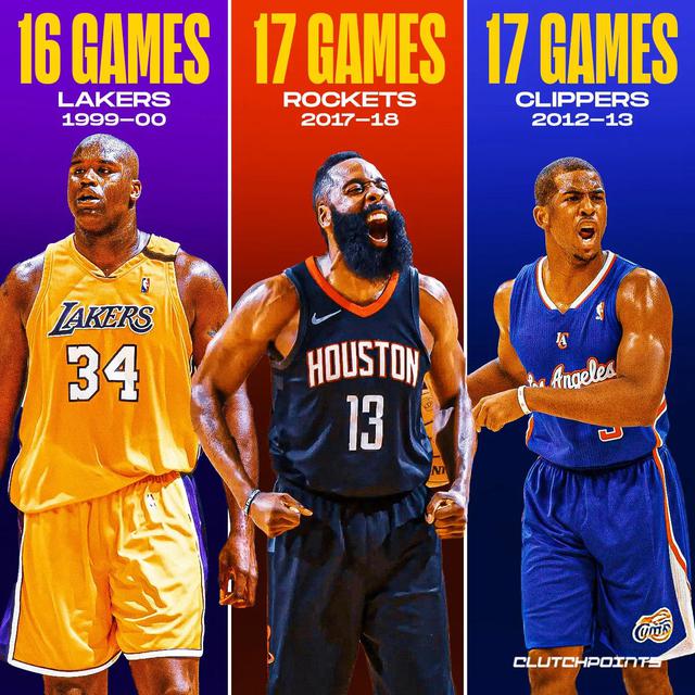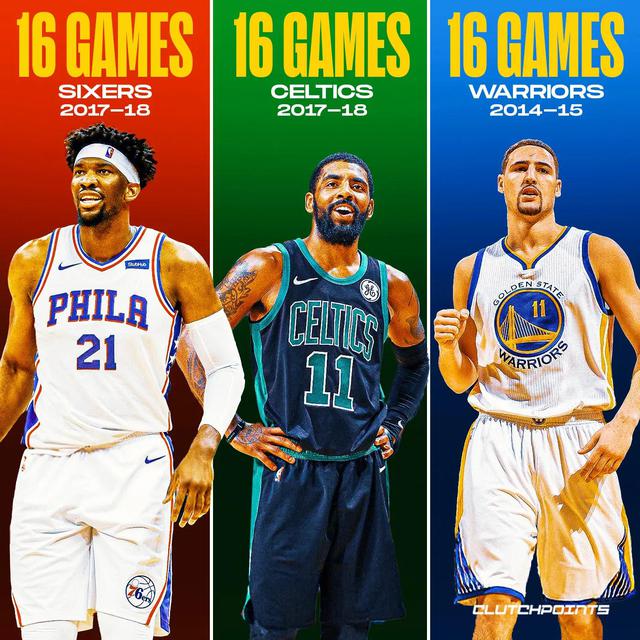 雄鹿2022-23 赛季、76 人 2017-18 赛季,凯尔特人 2017-18 赛季、勇士 2014-15 赛季、湖人 1990-00 赛季。金州勇士和湖人队正在完成。 16 在季后赛中,连胜的赛季都获得了 NBA 冠军。