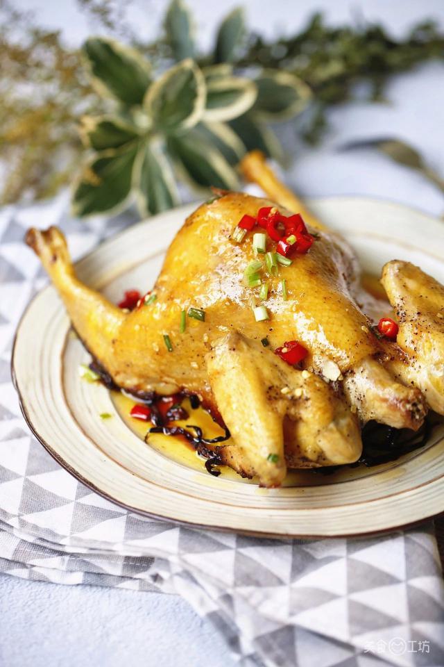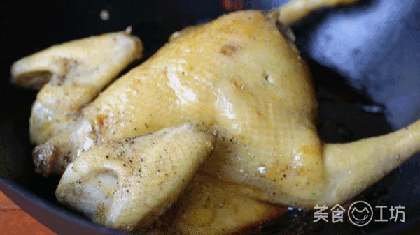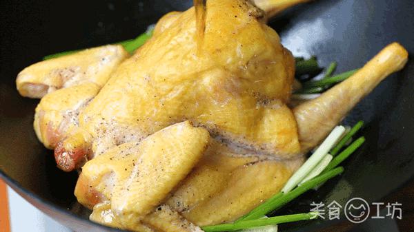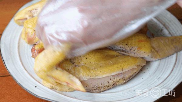 1. 三黄鸡不到二斤清洗干净后,鸡内外均匀涂抹适量盐、胡椒粉,静置腌制半小时。