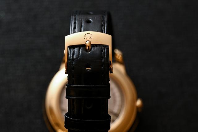 这款手表搭配了一条黑色鳄鱼皮表带。这种材质的表带不仅手感柔软细腻,而且质感极佳,与金色表壳相辅相成,增添了一些奢华感。尤其是秋冬季节,皮带不会冰冻手腕。小三针手表藏在袖子里,不经意间透露出佩戴者优雅高级的审美。