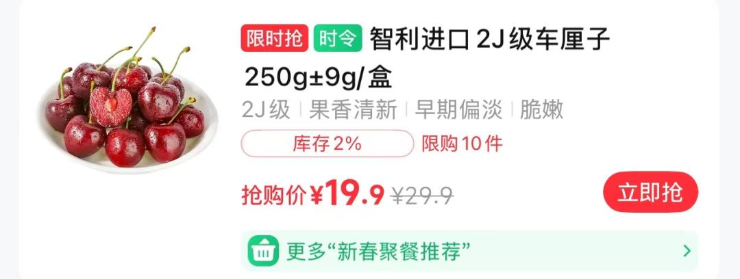 更重要的是,在中国统一大市场的协调下,樱桃的运费“下降”了。此外,许多企业推出营销活动,以迎合新年。看到“顶级水果”价格下跌,很多消费者都很兴奋。“前两周在店里看到的2J樱桃,50-60元一斤,现在便宜多了,准备多买。”正在选择樱桃的顾客黄女士说。