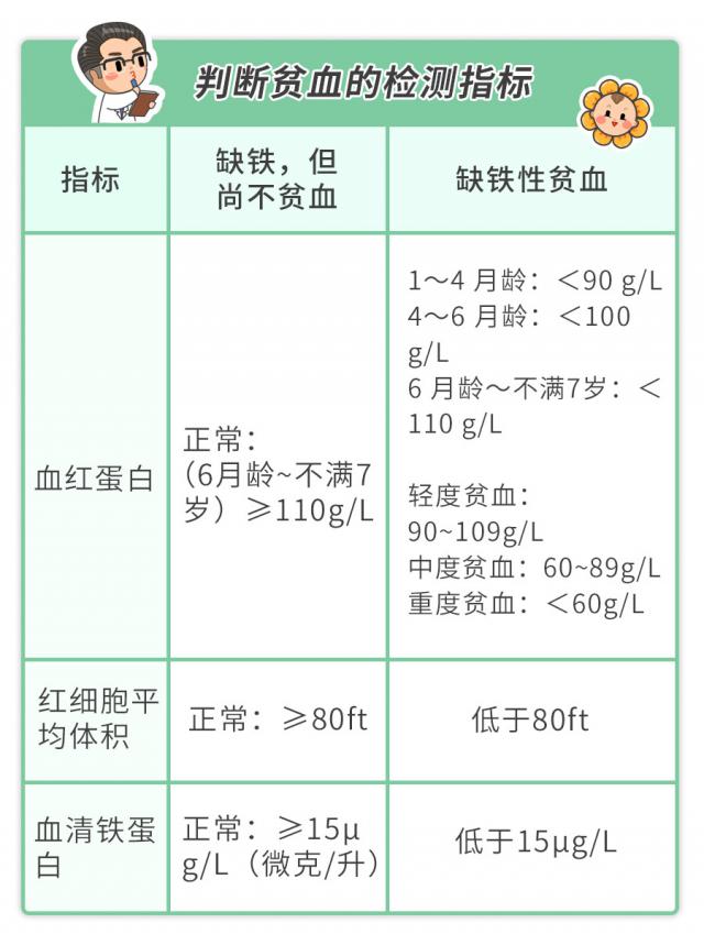 根据婴儿的年龄(月),我们给出了血检指标来判断贫血。