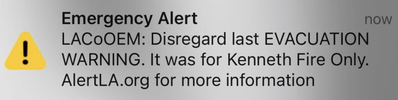 据《环球时报》援引当地媒体报道,当地时间9日,洛杉矶县官员向该县所有居民发送了疏散报警信息,并敦促他们做好充分的疏散准备。随后,洛杉矶县应急管理负责人凯文·麦高恩表示,这一信息应该发送给该县所辖的卡拉巴萨斯和其他地区的居民,但却被“错误”地发送给了更多地区的居民。这引起了当地居民的不满,一些网民呼吁撤回责任人。