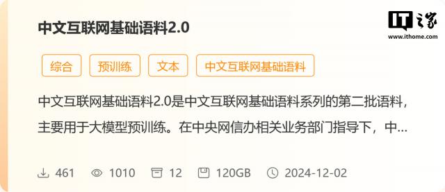 协会表示,在中央网络信息办公室的指导下,会同国家互联网应急中心发布了中国互联网基础语料料料料料。 1.0 在此基础上,依托专委会建立的语料共建共享机制,通过信源选择、内容过滤、数据去重等一系列严格细致的数据处理措施,聚集了一批新的优质可信数据。形成并向社会发布中文互联网基础语料料料 2.0,规模 120GB,数据 3800 万条。