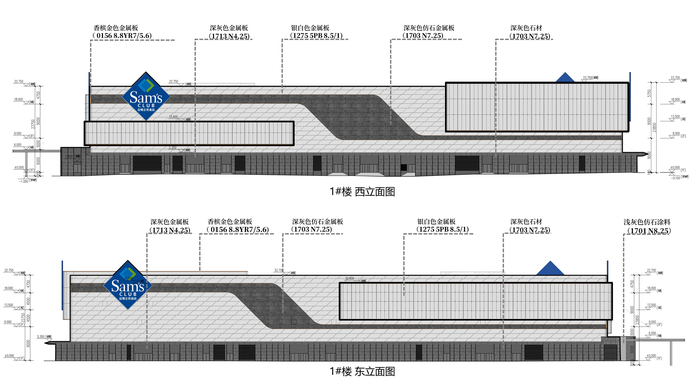 从选址来看,山姆会员商店在凤凰路东侧设置了一个机动车入口,在花园东路以南和超市东侧设置了两个机动车进出口。规划1050个地下停车位,50个地上快充桩停车位,182个地下充电设施停车位;573个地上非机动停车位。超级市场主要出入口位于工业南路向北,户外宣传场地面积约300平方米;花园东路以南项目用地红线路面部分为堆货区。从建筑物的外观来看,超级市场的蓝色LOGO都位于商品的外立面,外立面的主体是银白色金属板和深灰色仿石金属片。