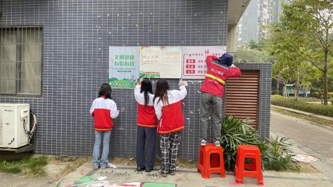 1月8日上午,在江海区团委和礼乐街道团工委的指导下,礼乐街道中福社区党员干部、全职网格员联合广东江门幼儿师范高等专科学校“邑童创”志愿团队,为深入实施“百县千镇万村优质发展工程”,落实全域清洁四大行动,进一步提升人居环境质量,充分发挥志愿服务在基层治理中的能效。青春引新风活动,响应居民建议,改变墙壁“旧貌”。