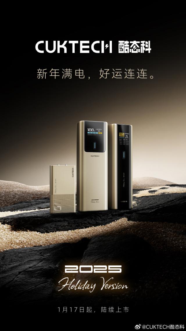IT 世家 1 月 11 日消息,酷态科 1 月 10 日本宣布,数字系列新年特别版 1 月 17 从几天开始陆续上线。官方海报中出现了三种产品估计。 6 号氮化邈充电器, 10 号码超级电能棒 Plus 以及 15 号码超级电能柱 Ultra,全部采用金色配色。