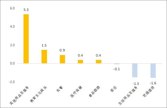 其他七类价格同比上涨三次。其中,其他产品和服务价格上涨5.3%,教育文化娱乐价格上涨1.5%,服装价格上涨0.9%,医疗健康价格上涨0.4%。;交通价格下降1.6%,生活用品和服务价格下降1.5%,居住价格下降0.1%。