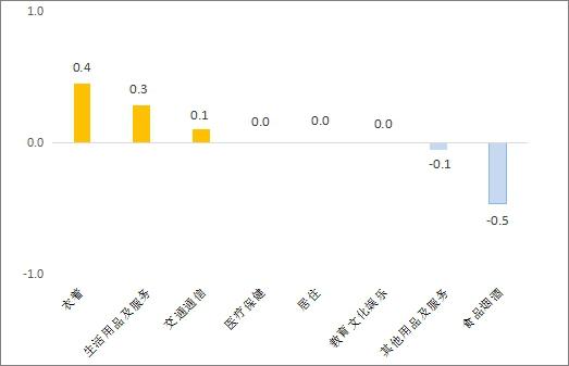 食品烟酒价格下降0.5%,CPI下降0.13%左右%。在这些蛋中,鸡蛋价格上涨0.4%;水产品价格下降1.4%,CPI下降0.02%左右%;新鲜蔬菜价格下降1.7%,CPI下降0.03左右%;新鲜水果价格下降1.9%,CPI下降0.03左右%;动物价格下降1.9%,CPI下降0.06左右。%,其中,猪肉价格下降2.8%,CPI下降0.05%左右%。