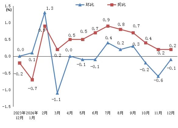 图1 居民消费价格在2023年12月至2024年12月每月涨跌(%)