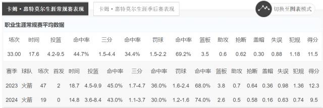 惠特摩尔上个赛季为火箭队而战 47 比赛,其中 2 首发。平均每场比赛 18.7 分钟,获得 12.3 分 3.8 篮板 0.7 助攻 0.6 断球 1 错误,三个准确率:45.4%,35.9%,67.9%。惠特摩尔本赛季的上场时间和数据不言而喻,全面下滑。