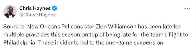 随后名记 Haynes 据报道,锡安决定对他进行一点惩罚,因为他太晚了,赶不上昨天全队飞往费城的飞机,本赛季几次训练都很晚。锡安只停赛 1 在此之前,热火以巴特勒对球队的伤害停止了比赛。 7 场。到目前为止,锡安因伤只为鹈鹕而战。 7 场上比赛,场均比赛 22.6 分 7.7 篮板 5.1 助攻,投篮命中率 47.1%。锡安说晚到没有借口,已经向全队和球迷道歉了。薪酬专家 Marks 表示,锡安因停赛而停赛 1 场损失 253,280 美金。