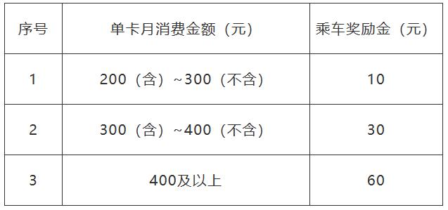 每个自然月内,武汉一张普通卡在轨道交通乘车消费额度(消费额度) = 出闸扣费额度 卡内更新金额,不含持卡购票金额)达到 200 元后,在享受原 9 在优惠价值的基础上,给予乘车奖励。武汉通卡需要绑定账户后,将乘车奖励存入相应的武汉通卡。乘车奖励金以乘客单卡当月消费金额达到水平为准,不按水平累计计算。乘车奖励金的发放标准如下: