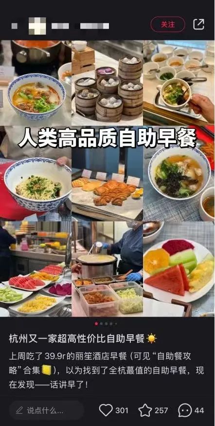 比如最近小红书的热门话题之一——“酒店自助早餐”,我们发现酒店早餐大部分都是家里常见的面条、馒头、小面包等食材,但相当一部分顾客愿意为此买单。这些热衷于在酒店吃自助早餐的人和消费者认为,虽然大部分酒店早餐都没有昂贵的食材,但是品类多,价值高,几十块钱就能品尝到很多想吃的东西。这种自由放松的感觉很少见。