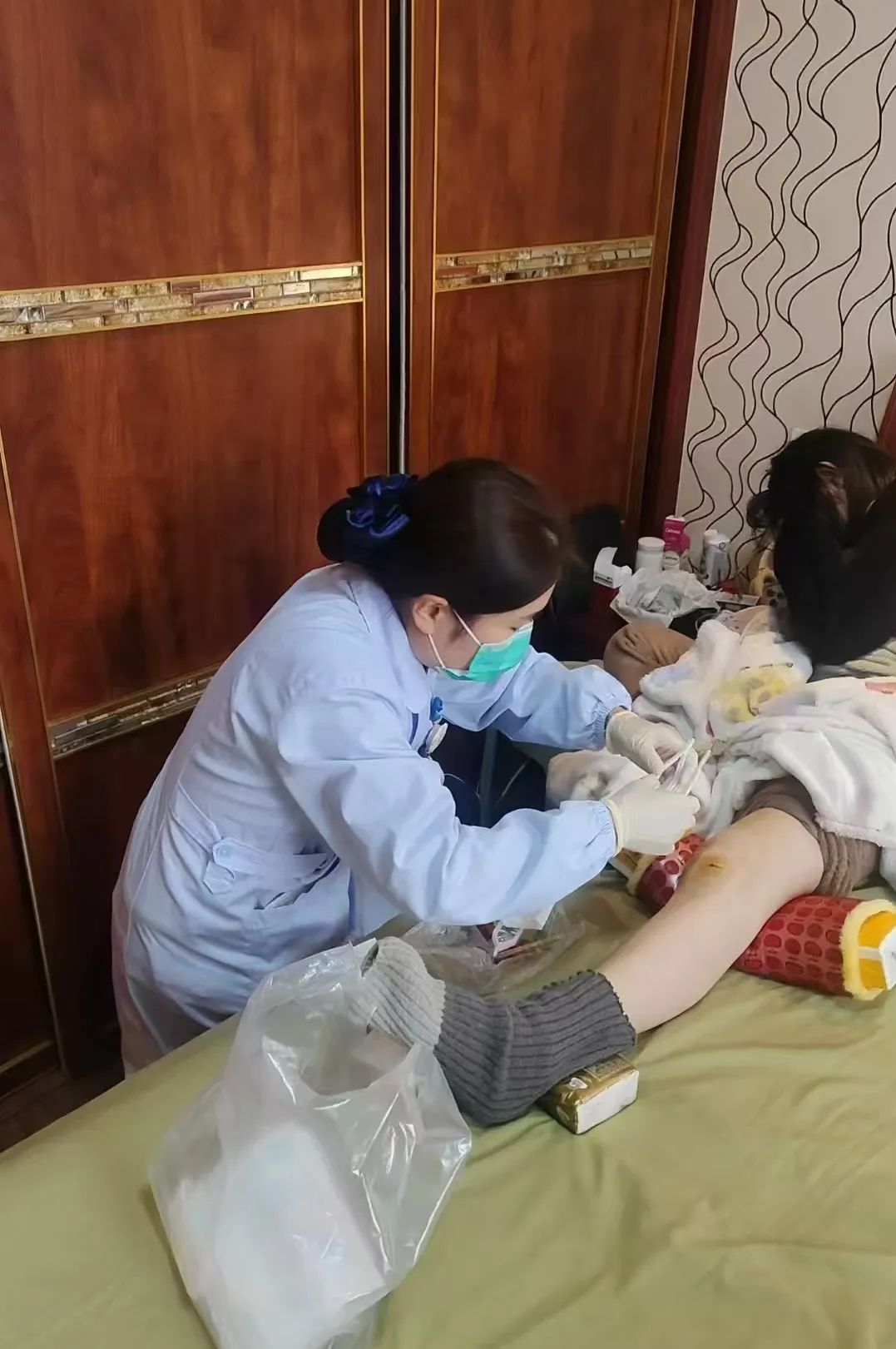 当唐桦到达居民家门口时,他的家人已经感激地在门外等待。唐桦小心翼翼地为居民拆线换药。她的每一个动作都透露出她对工作的认真和对病人的关心。
