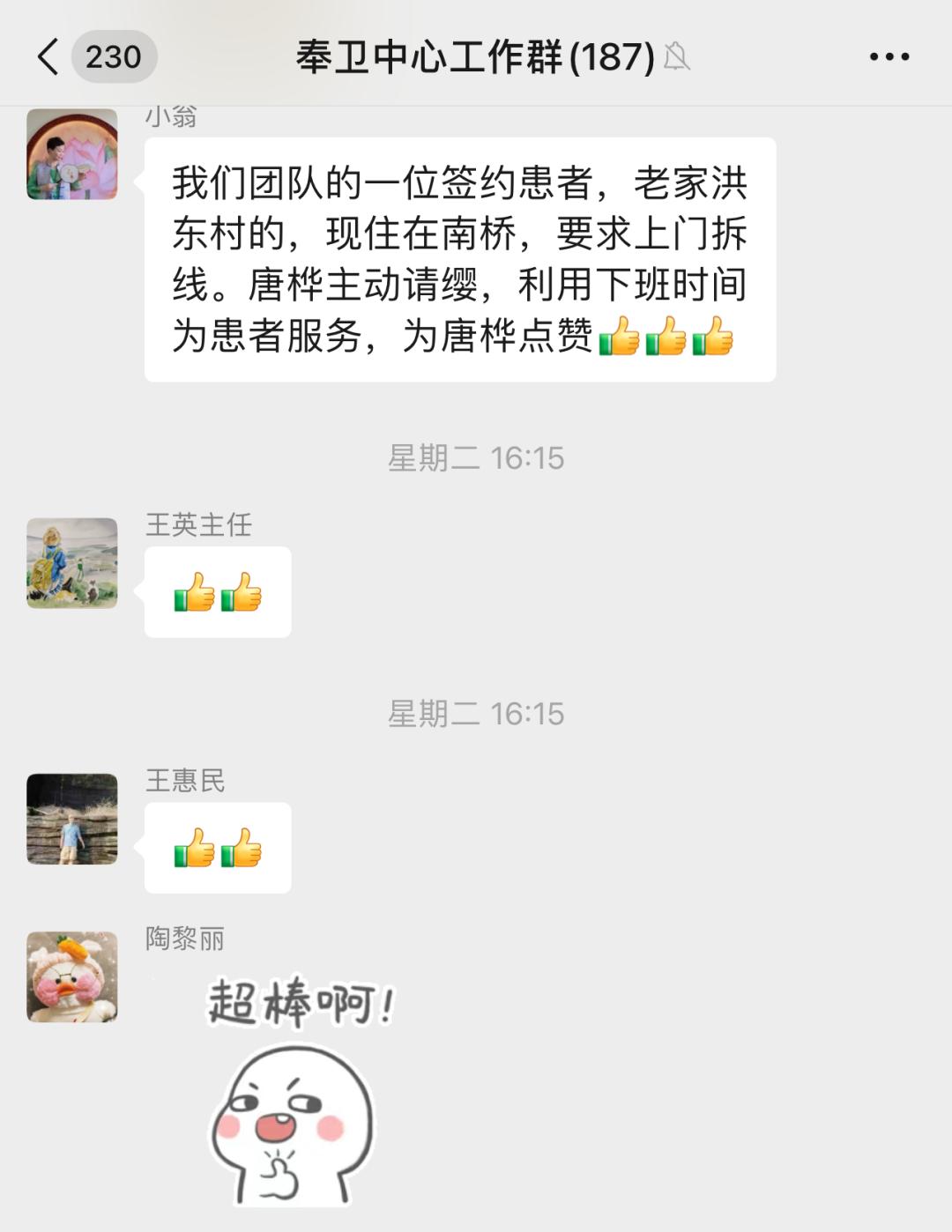 这项上门服务不仅解决了居民的迫切需求,也让她深刻感受到了家庭医生的关怀和敬业精神。这一事件在奉城社区卫生服务中心传播,不仅展示了家庭医疗团队的专业和奉献精神,也体现了他们“以患者为中心”的服务理念,为每一位签约居民提供了全面的健康守护。
