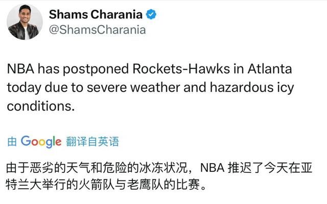 再推迟一场!明天火箭Vs老鹰比赛也会因为天气极端而推迟。