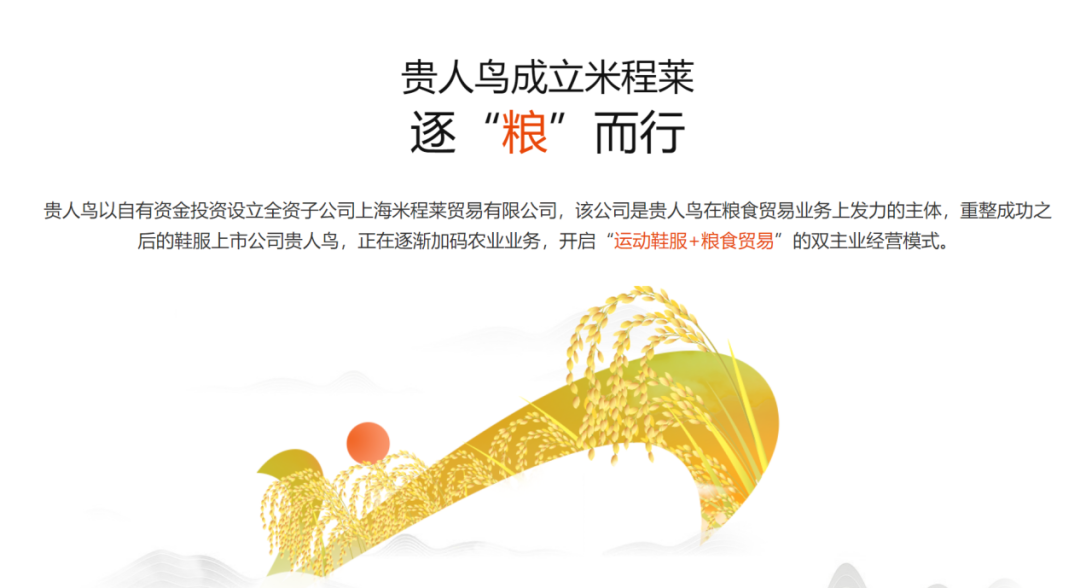 官网上的贵人鸟,依然有“运动鞋服” “粮食贸易”双主业商业模式的宣传。