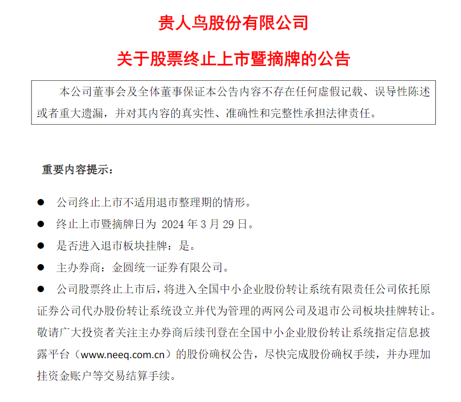 根据有关规定,2024年2月1日至2024年3月7日,贵人鸟股票连续20个交易日每日收盘价均低于1元,上海证券交易所决定终止企业股票上市。贵人鸟于2024年3月29日正式从a股退市。