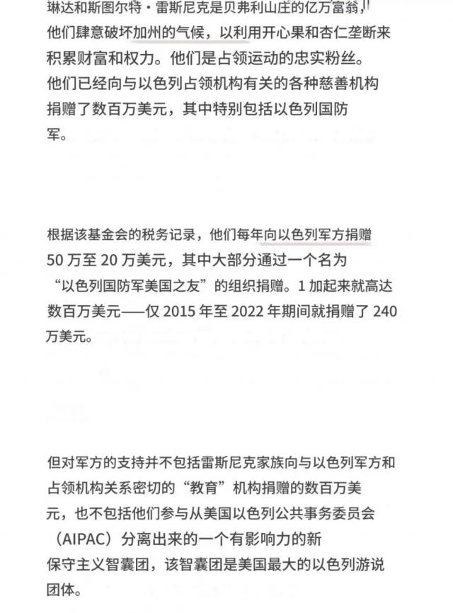 雷斯尼克家族仍然是坚定的“犹太复国主义者”、“以色列之友”,每年向以色列国防军捐赠数百万美元,支持他们攻击加沙,杀害巴勒斯坦人。