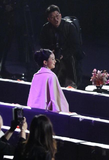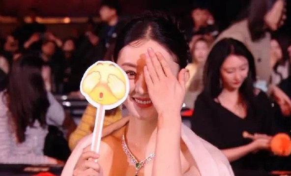 舞台下的赵丽颖心情很好,拿着小道具和镜头前的观众互动,还比道具上捂着脸的小表情,整个人可爱,真诚可爱。