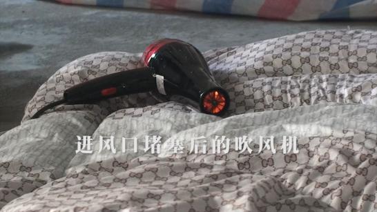 ▲进气口被挡住的吹风机过了一会儿,里面的加热丝变红了。