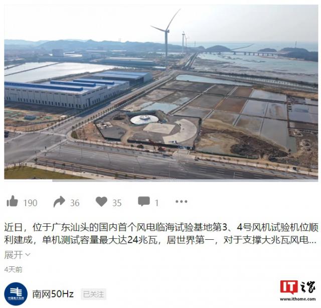 IT 世家 1 月 12 据中国南方电网有限公司消息,近日,广东省风电临海试验基地第一 3、4 号风机试验机位顺利建成,单机检测容量最大。 24 兆瓦,居世界第一。