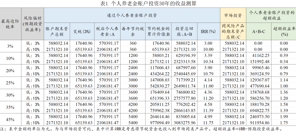 以一个35岁的农民工为例,假设他考虑每年在个人养老金账户投资1.2万元,投资30年,预计65岁退休时一次性领取养老金。为了方便比较,还假设个税按照现行政策保持一致,该工人每年面临的最高边际税率也保持一致。通过个人养老金账户投资可以享受税收优惠,而不是在市场上自行定投同等金额,带来的超额收益计算如表1所示。