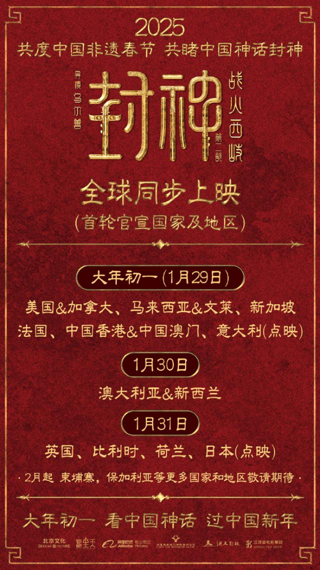 IT 世家 1 月 12 据日报报道,国产神话大片《封神第二部:战争西岐》昨日正式宣布将同时在全球多个国家和地区上映。这部电影已经在中国大陆定档了元旦(1) 月 29 日)。