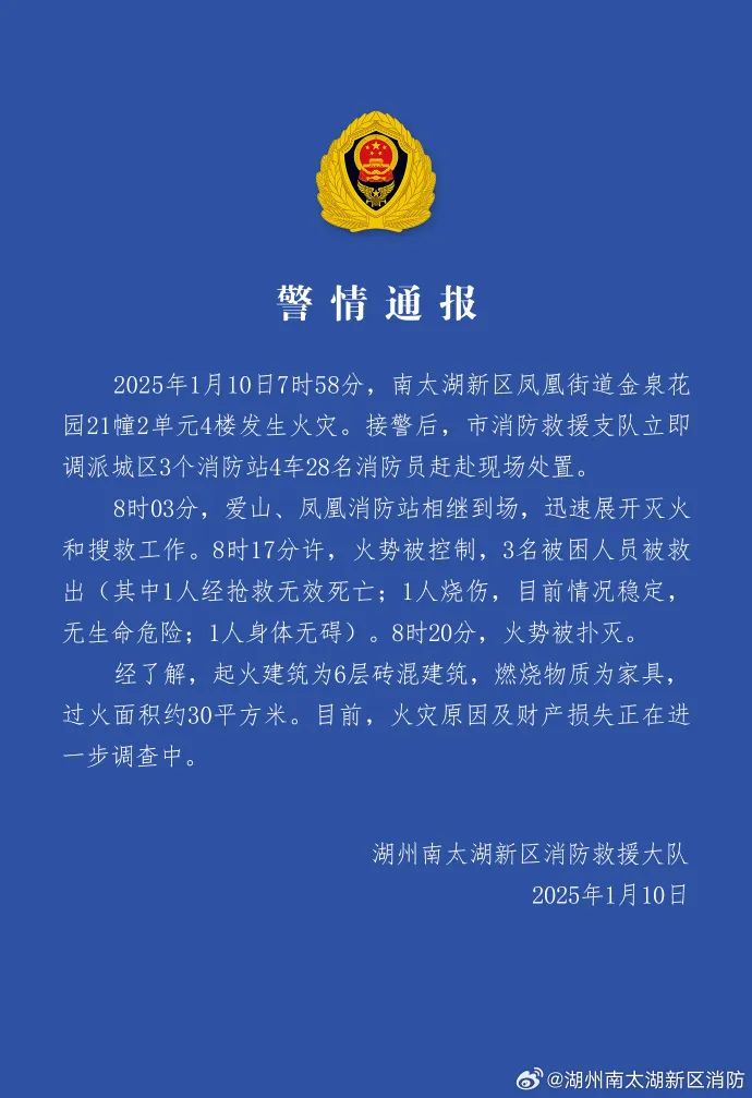 1月10日7时58分,南太湖新区凤凰街金泉花园21栋2单元4楼发生火灾。市消防救援支队接到报警后,立即派出市区3个消防站4辆车28名消防员赶赴现场处置。