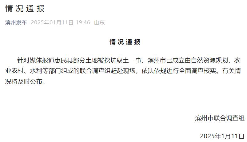 1月11日晚,滨州市联合调查组发布《情况报告》称,根据媒体报道,该地区已成立由自然资源规划、农业、农村、水利等部门组成的联合调查组,依法依规全面核实。相关信息将及时公布。