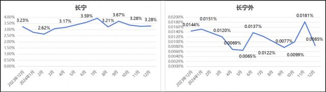 过去 1 年长宁与长宁(外环外部)的成交量占比