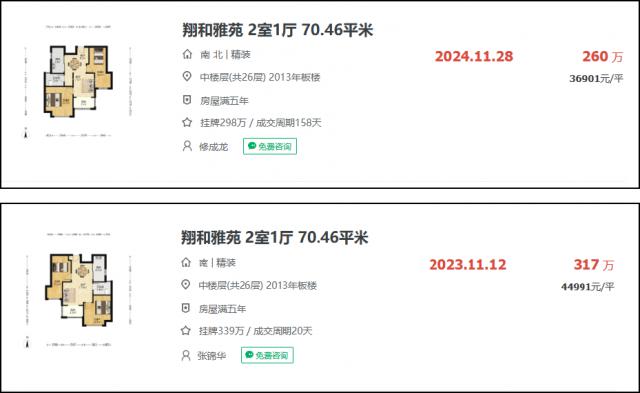 两室类型相同 2023 年 11 月成交价 317 万,2024 年 11 月成交价 260 万