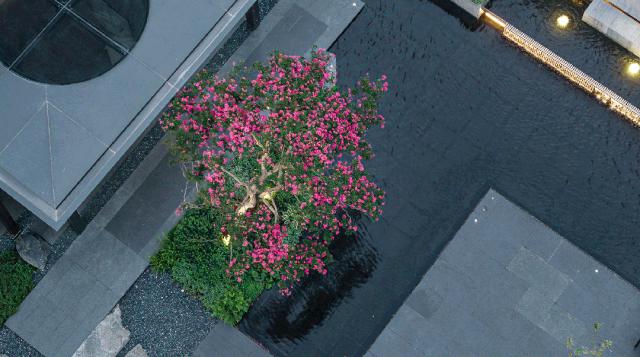 入口处的点状涌泉意味着改善气场,丰富和吸气。与前场礼仪空间相结合,凸显东方仪式感。