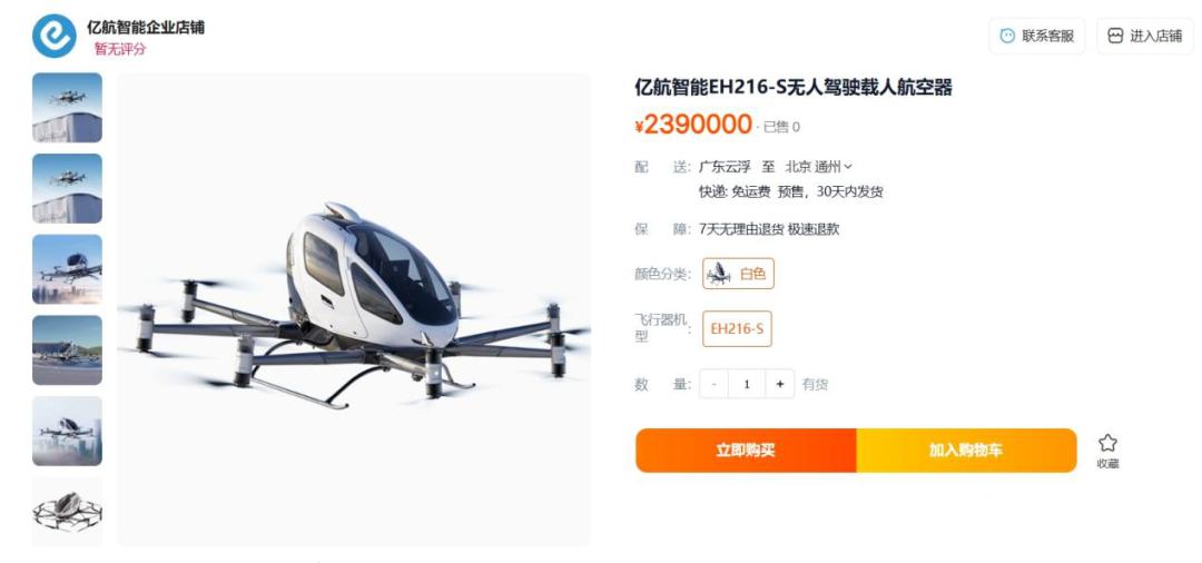 先来看成本,一个字:贵。2024年初,亿航智能在淘宝建立了“亿航智能企业店铺”,并上架了无人驾驶载人航空器EH216-S,售价239万元。同时,店铺内另一款VT-30长行距无人驾驶电动垂直起降航空器,标价近千万。