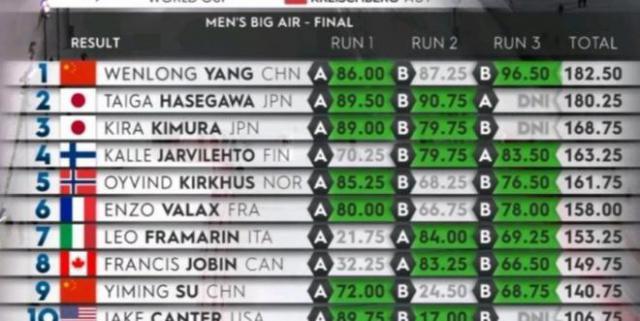 在第一跳出错误的情况下,资格赛杨文龙在第二跳和第三跳各自完成了两个方向。 1800,以 178.75 分数排在资格赛第一名。 1 位置,决赛最后一个出场。