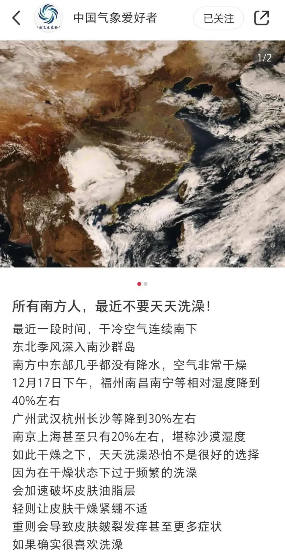 冬天又冷又干。你想每天洗澡吗?日前,知名科普博主“中国气象爱好者”发文呼吁南方朋友近期不要天天洗澡。