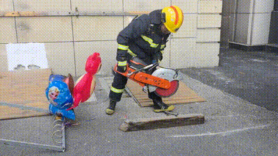试验过程:消防队员穿上防护服后,用无齿锯切割金属制品的火花,模拟点燃烟花后接触气球的危险情况。