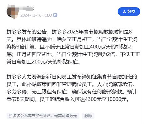 拼多多于 2024 春节假期时间在年底公布。