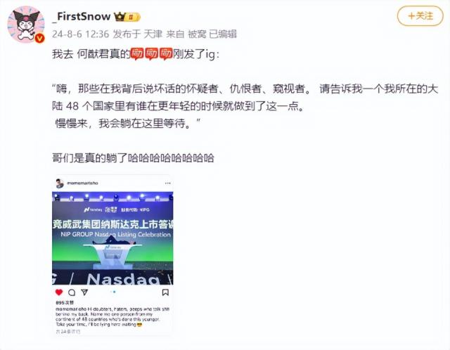 人逢喜事精神爽朗,近一年何猷君从娱乐榜火到财经榜,名下星竞威武集团于去年 7 每月在纳斯达克成功上市,成为第一家在美国上市的中国电子竞技集团,市值一度超过。 5 亿人民币。
